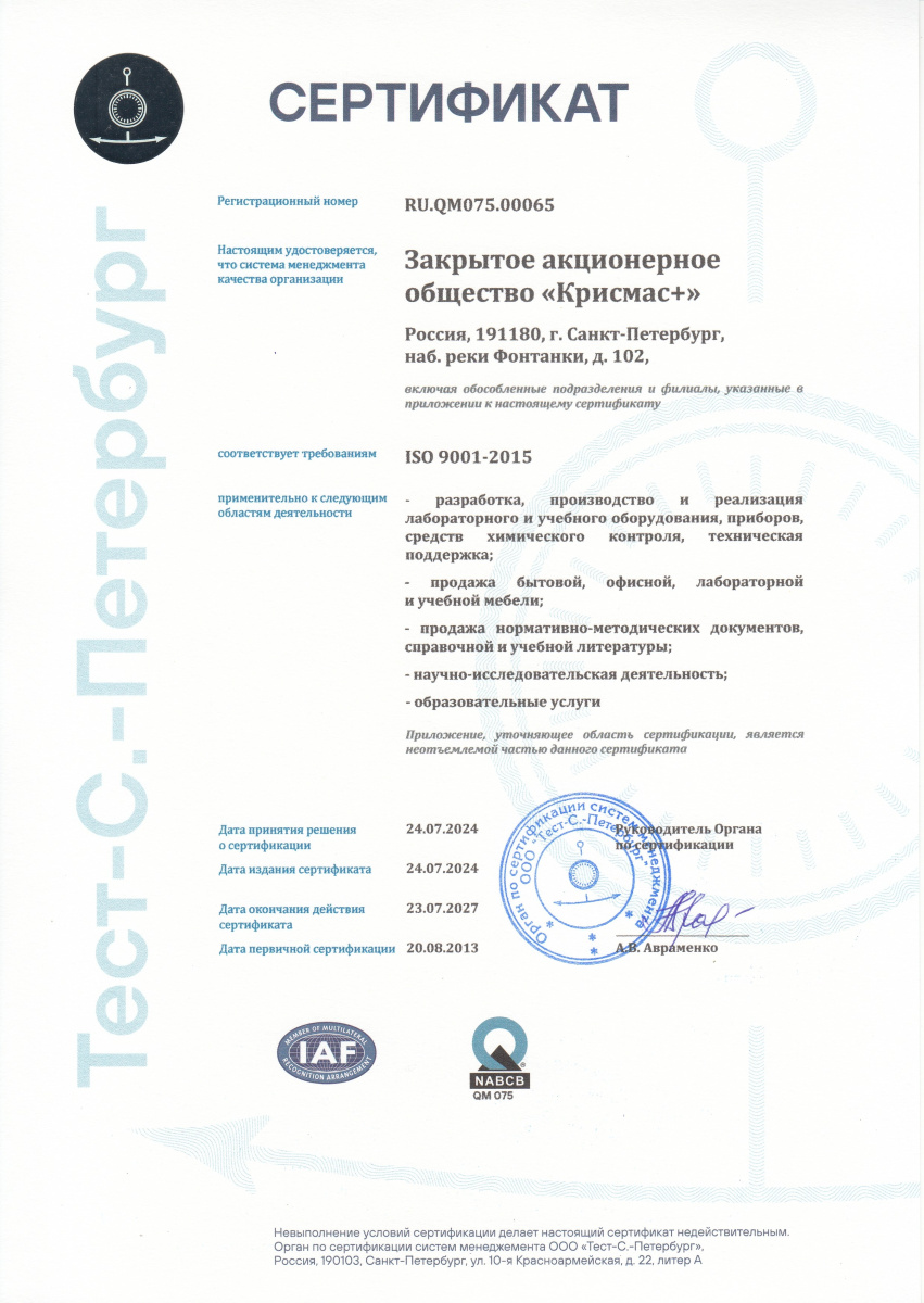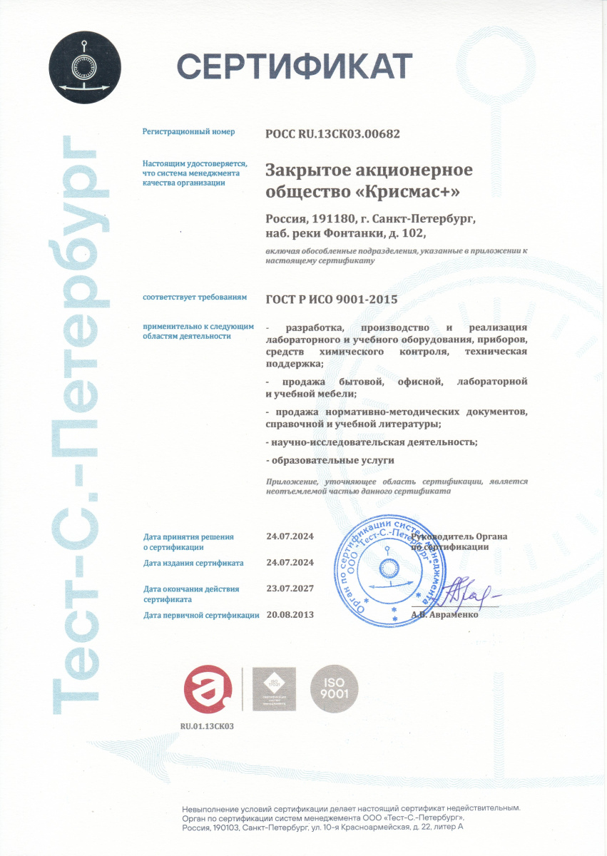 Подтверждение сертификатов позволяет ГК «Крисмас» укрепить свои позиции на рынке лабораторного и учебного оборудования. Компания демонстрирует способность эффективно управлять процессами, внедрять инновации и реагировать на запросы клиентов. Сертификаты ISO 9001-2015 открывают новые возможности для участия в тендерах и расширения географии продаж. Для клиентов подтверждение сертификатов – это дополнительная гарантия качества продукции и услуг. Компания продолжает совершенствовать свои процессы, чтобы предложить заказчикам широкий ассортимент оборудования, комплексные решения и высокий уровень сервиса.
